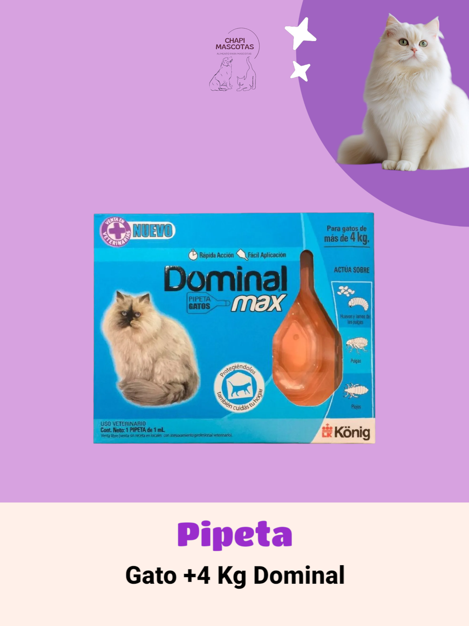 PIPETA GATO +4 KG DOMINAL Categorías1- Perro Adulto 2- Gato 3- Perro y Gato 4- Cachorro 5- Gatito 6- Adulto Raza Pequeña 7- Cachorro Raza Pequeña 8- Perros Senior 9- Pastillas, Pipetas y Collares 9.1- Adulto y Cachorro Productos para mascotas Sanitarios Para Gatos PIPETA GATO +4 KG DOMINAL$390 ✅ Beneficios destacados 🪳 Elimina pulgas y piojos – actúa sobre adultos y huevos📦 Contenido: 1 pipeta de 1 ml🧴 Fácil aplicación – solo en la nuca🕐 Duración: hasta 1 mes de protección🐾 Recomendado para gatos mayores a 4 kg PIPETA GATO +4 KG DOMINAL cantidad Comprar ahora Categoría: 9- Pastillas, Pipetas y Collares Productos relacionados NEXGARD SPECTRA 15 A 30 KG $750 Añadir al carrito PIPETA DE GATO $290 Añadir al carrito COLLAR MEDIANO DOMINAL $550 Añadir al carrito COLLAR GATO DOMINAL $490 Añadir al carrito